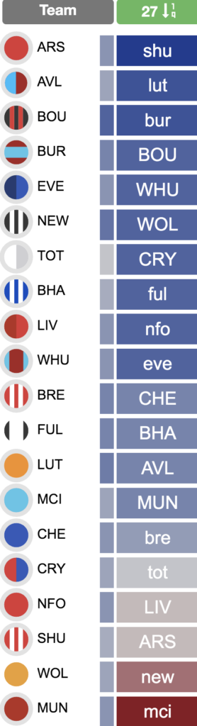 The Premier League’s current top five all have very decent fixtures in Gameweek 27, with favourable match-ups for Liverpool (nfo), Manchester City (MUN), Arsenal (shu), Aston Villa (lut) and Tottenham Hotspur (CRY).