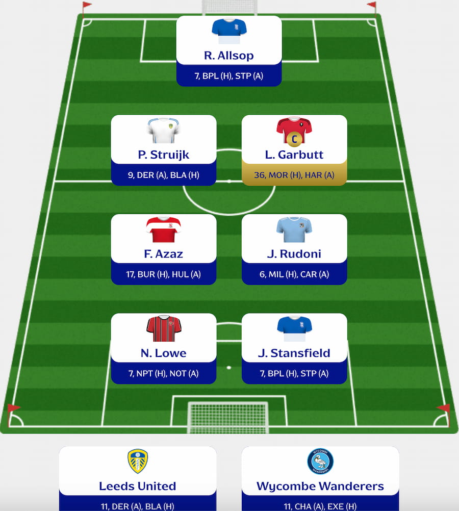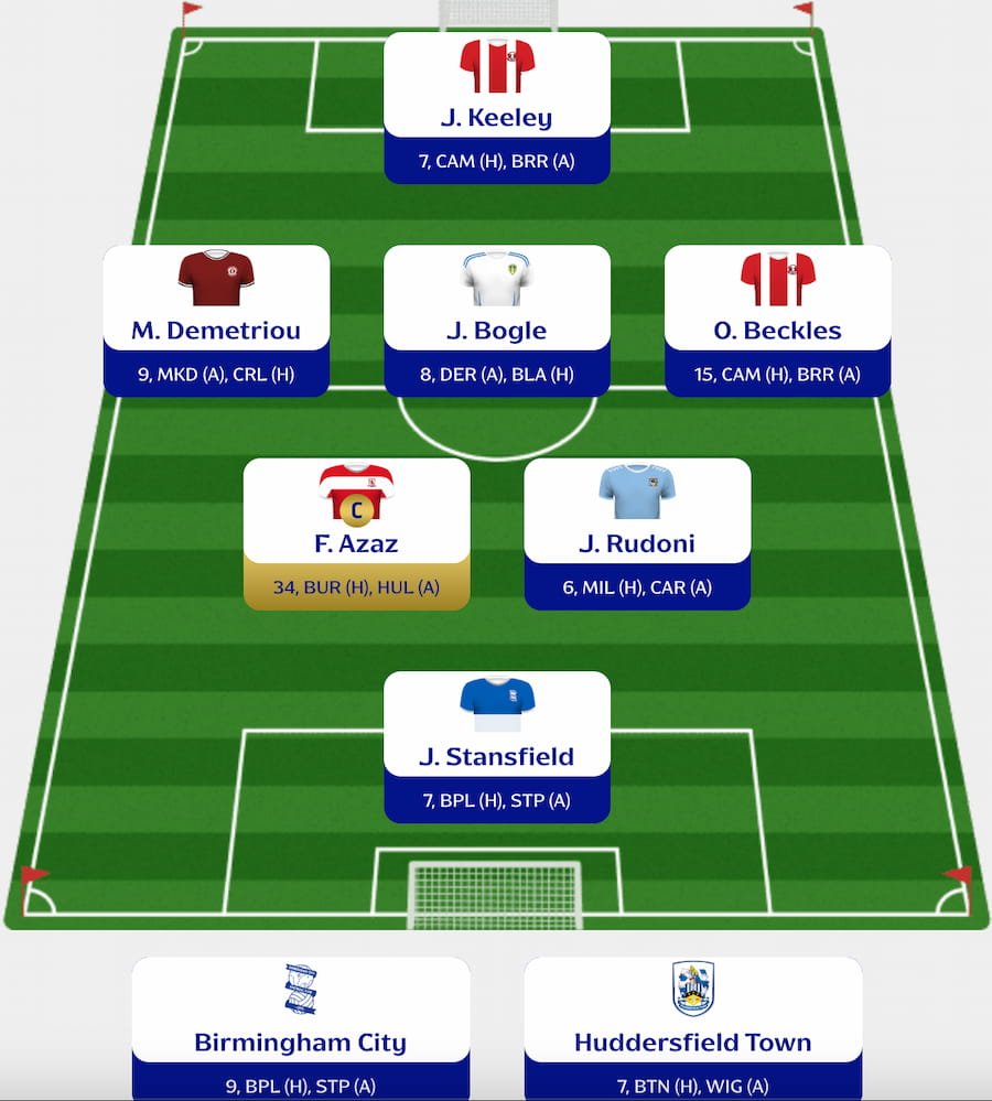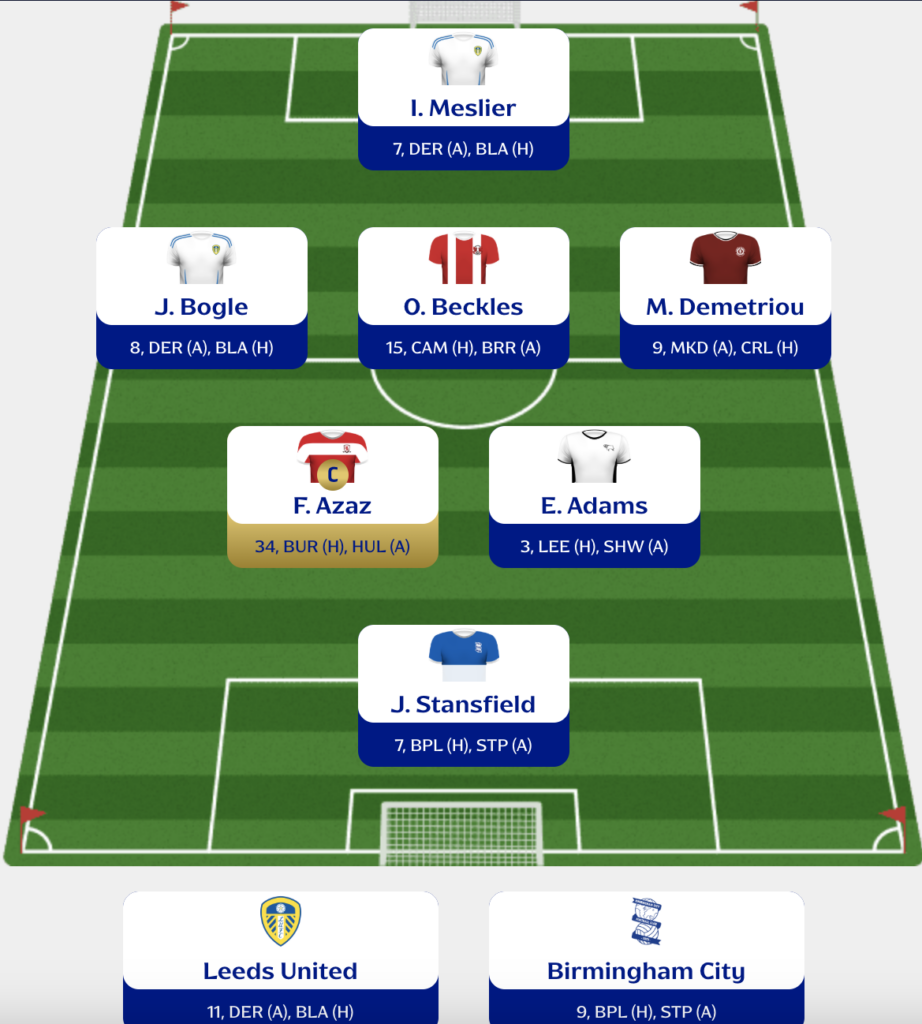 This manager has scored 102 Fantasy points through one set of fixtures, and looks set to net a lot more than that by the end of the Gameweek. The dominant Finn Azaz (M) is once again the Max Captain selection for this side, with a huge 34-pointer making up a third of the 102 points. Jay Stansfield (F) was another popular pick who is rewarding managers, with all three of these teams selecting him. The Birmingham City talisman has consistently recorded goal contributions and the fixture against Burton Albion was no exception. Stansfield is likely to be involved once again in the upcoming match against Blackpool (H). Their leaky defence, having conceded 33 goals in 21 games, presents a prime opportunity for Stansfield to make his mark.