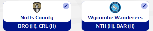 The club picks partially align with my player selections this week with Notts County and Wycombe Wanderers the two sides I have backed.