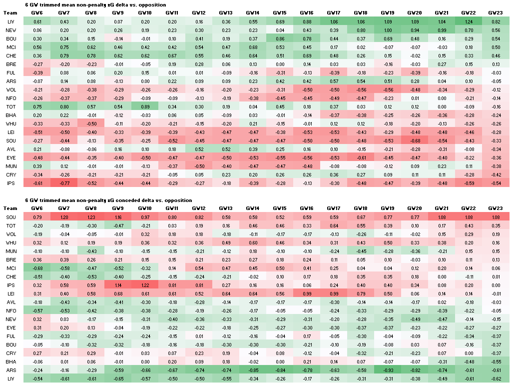 Basically it's a fixture adjusted xG i.e. Liverpool are currently scoring around 0.8 xG more than expected per game given the opposition in that period, while Ipswich 0.5 fewer. Defensively Southampton are conceding 1.1 xG more than expected per game, while Liverpool 0.6 fewer.