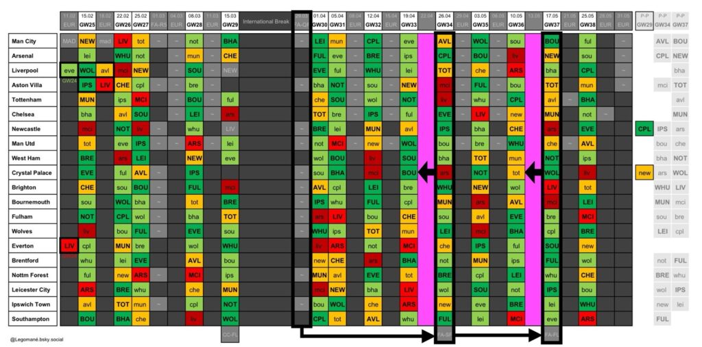 Above: The superb schedule graphic, provided by Legomane (click to expand) – since then, Newcastle United v Crystal Palace has been confirmed for Double Gameweek 32