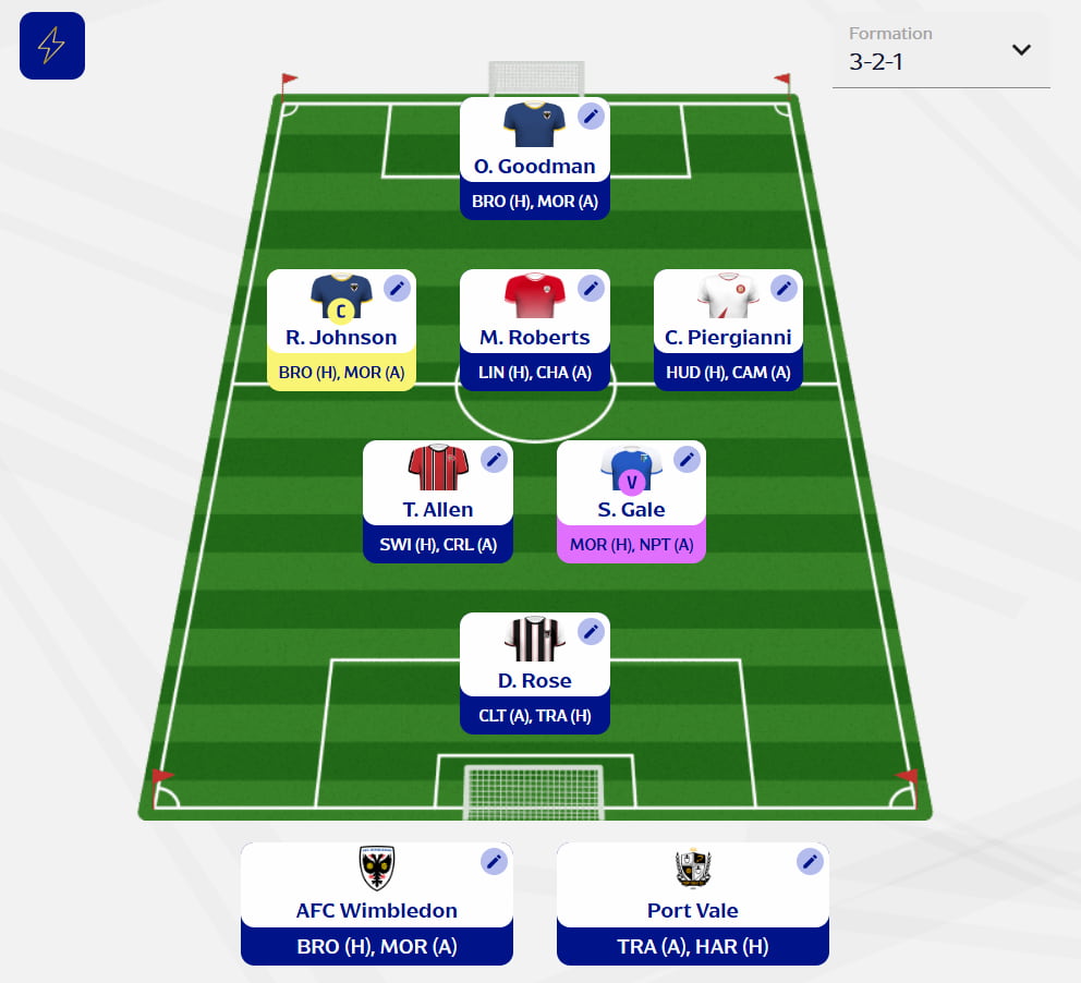 In fact, I don’t think merely having double AFC Wimbledon defence is enough. Not only have I decided to bring in defensive point action machine Ryan Johnson (D), I’m giving him the captain’s armband. Johnson goes into every game with multiple routes to points, making him an essential in Double Gameweeks.