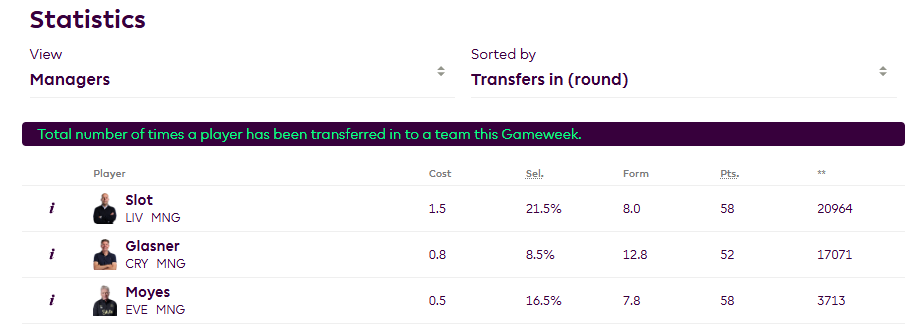 A similar trend of backing the favourites is emerging this week. With Southampton up next for Liverpool, it is hardly the greatest surprise to see Slot selected as the most popular choice for Gameweek 28, given Liverpool’s relentless march towards the title. For similar reasons, after trouncing Villa 4-1, there has been a run on Oliver Glasner (£0.8m), ahead of Palace’s home match against lowly Ipswich.