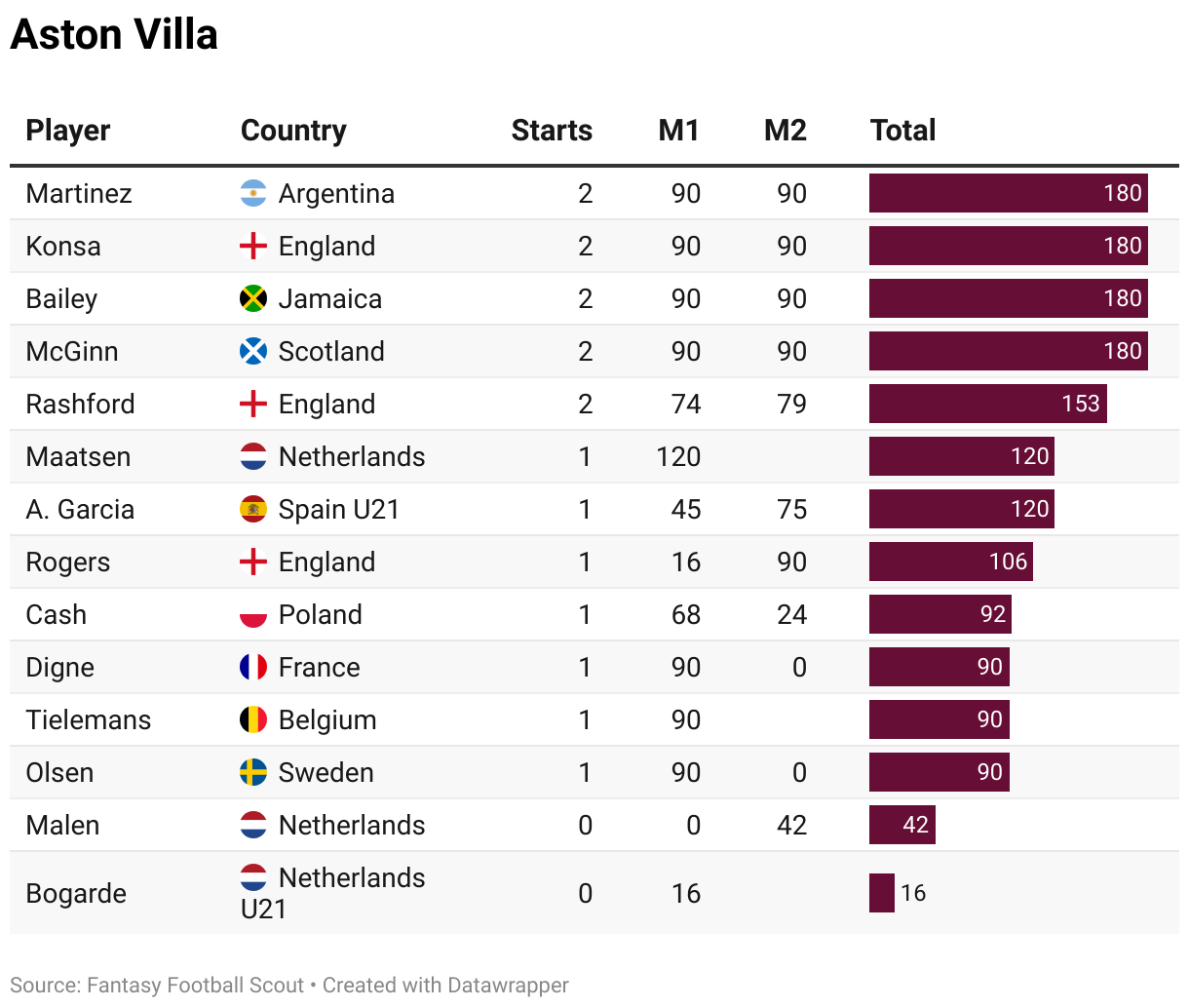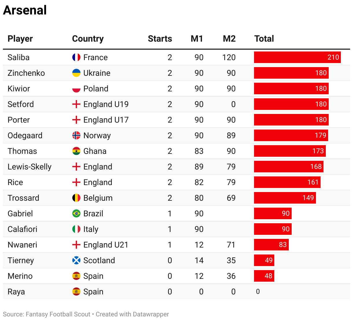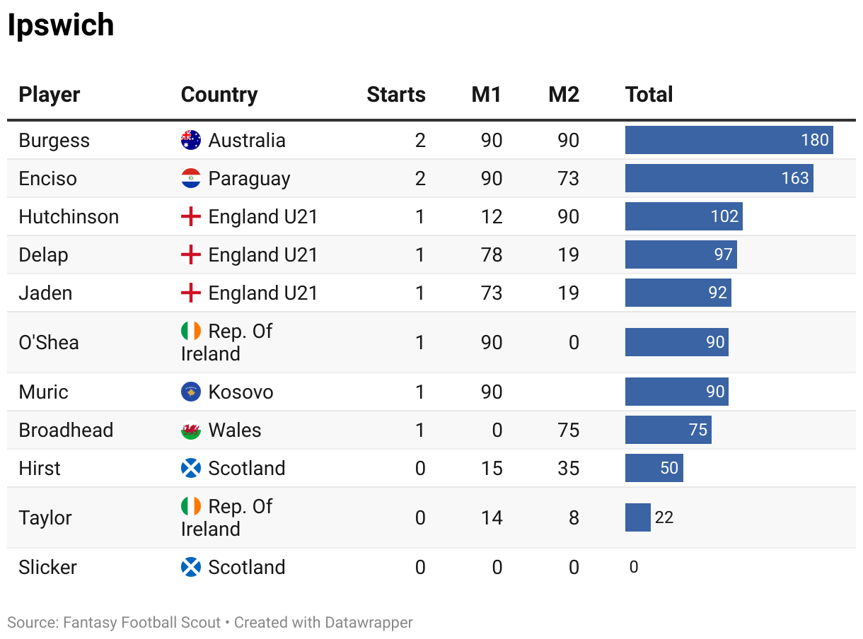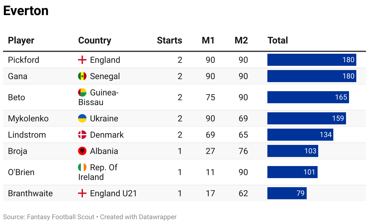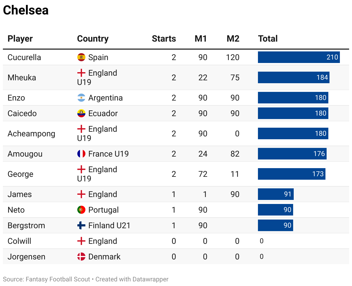 Please note that any gaps in the M2 column should be because a player didn’t appear in the matchday squad in one of their countries’ two internationals (not necessarily the second game).