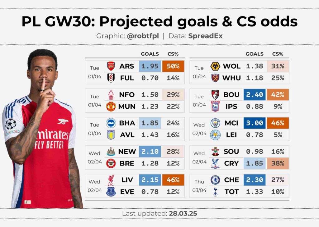 Let us have a look at Rob T’s graphic first and see what the markets are saying about Gameweek 30.