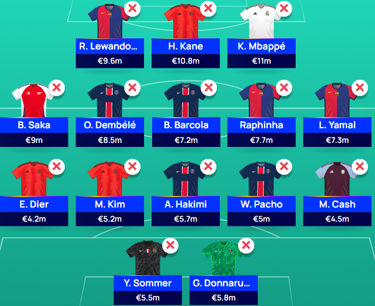 Meanwhile, our pricey team requires a budget option to complete the defence. Grabbing an Arsenal defender is tempting, but their clean sheet chances are even lower than Aston Villa’s. If Matty Cash (€4.5m) fails to produce a defensive masterclass – something Villa have done previously in Europe – then he can still bank ball recoveries against a lively PSG frontline.