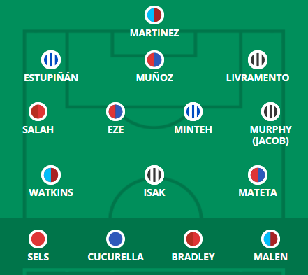 Our champion this week is Hairy Potter, who has gone for: Henderson; Livramento, Dunk, Estupinan; Sarr, Eze, Asensio, Malen, Barnes; Isak (c), J Pedro