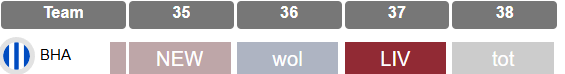 Brighton themselves have a tough-looking run-in, so FPL interest will be minimal in their players. Liverpool’s early title win and Spurs’ potential UEFA Europa League final involvement could work to their advantage, at least.
