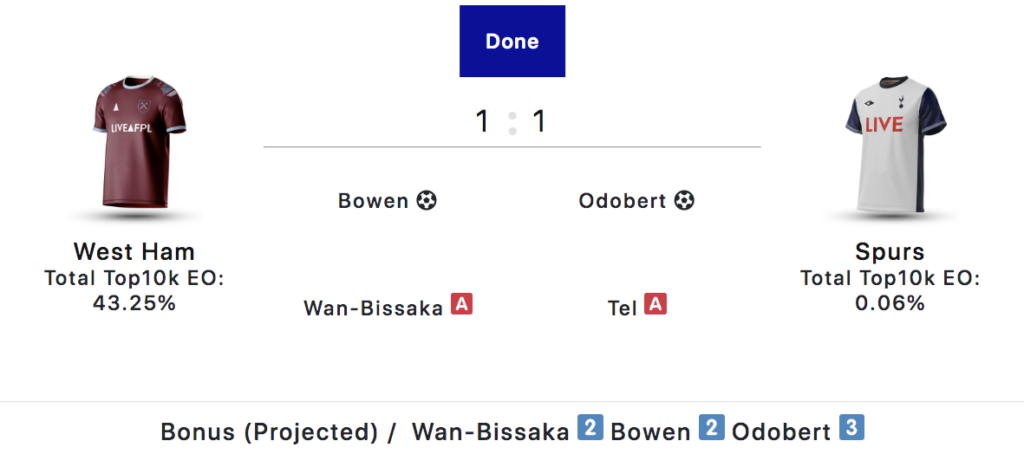 Just caught up with tonight’s scores. Happy with Bowen as captain for 18 points but gutted left Wan bissaka on my bench. He was in my starting XI and then I asked on here if it was mental to start him over Saliba where the response was it was mental.
