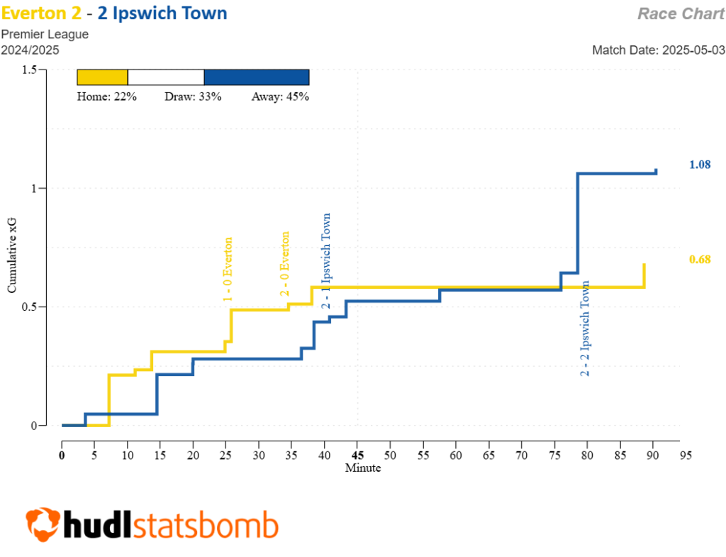 You couldn’t really argue that Kieran McKenna’s side merited a point, however. There was one thunderbolt from each side, and one close-range headed goal apiece too. The visitors even edged the shot count (8-12) and xG race (0.68-1.08, via Statsbomb).