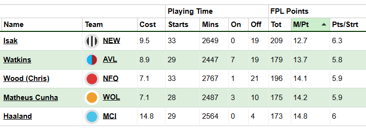 Above: Watkins’ average of 13.7 minutes per FPL point is second only to Alexander Isak (£9.5m) among current first-choice strikers