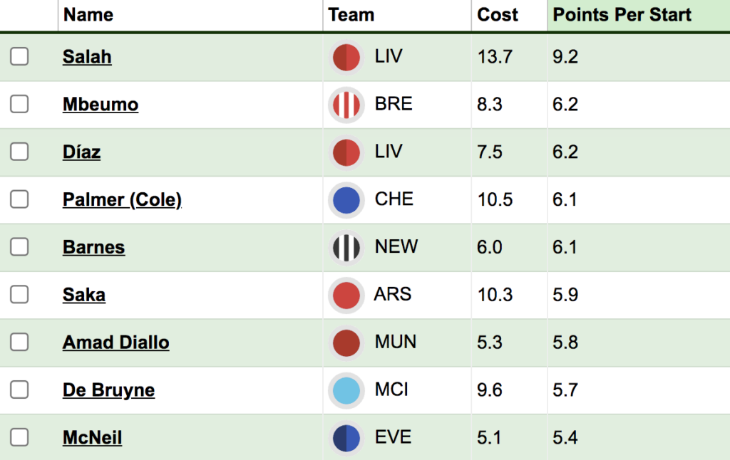 Above: Midfielders sorted by points per start in 2024/25 (minimum 1,000 mins)