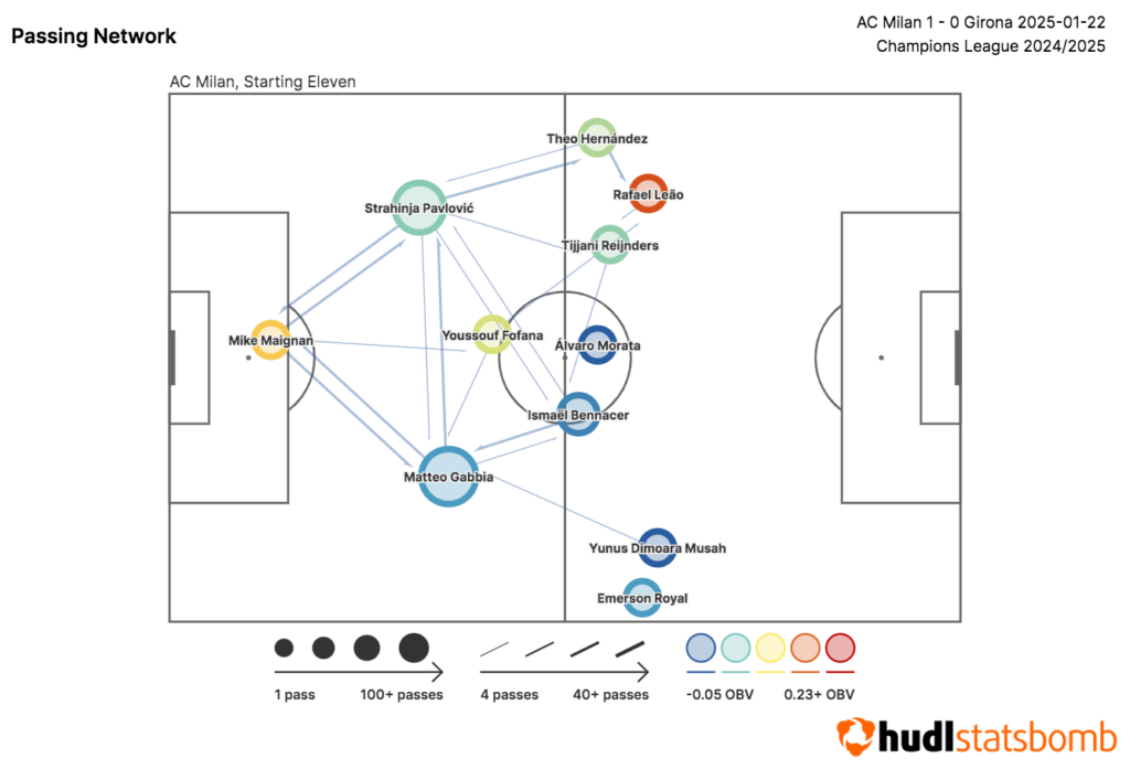 Above: AC Milan’s pass map against Girona in January, showing Reijnders’ position as a left-sided No 8