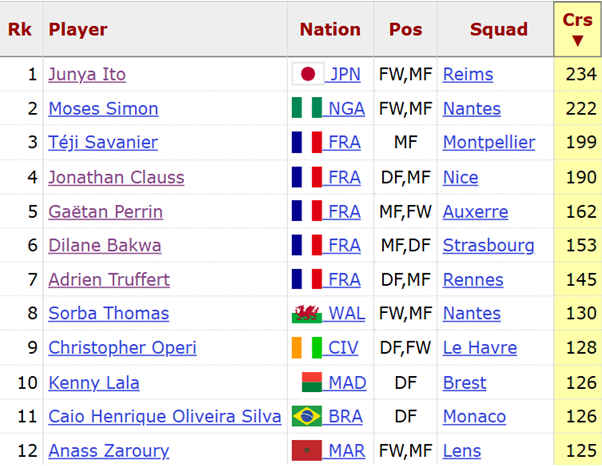 Above: The most frequent 2024/25 crossers in Ligue 1, via FBref