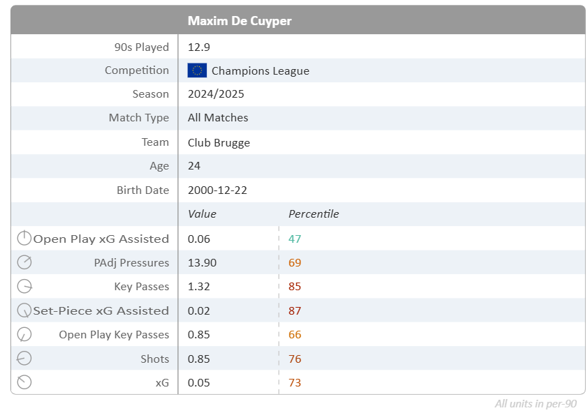 The same site’s ‘Scout Report’ sums De Cuyper up in one graphic: eye-catching attacking numbers, question marks over defending.