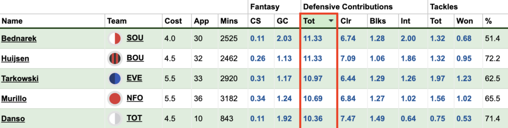 Using Defenders as an example, you can see defensive contributions ‘per 90’ highlighted in red below: