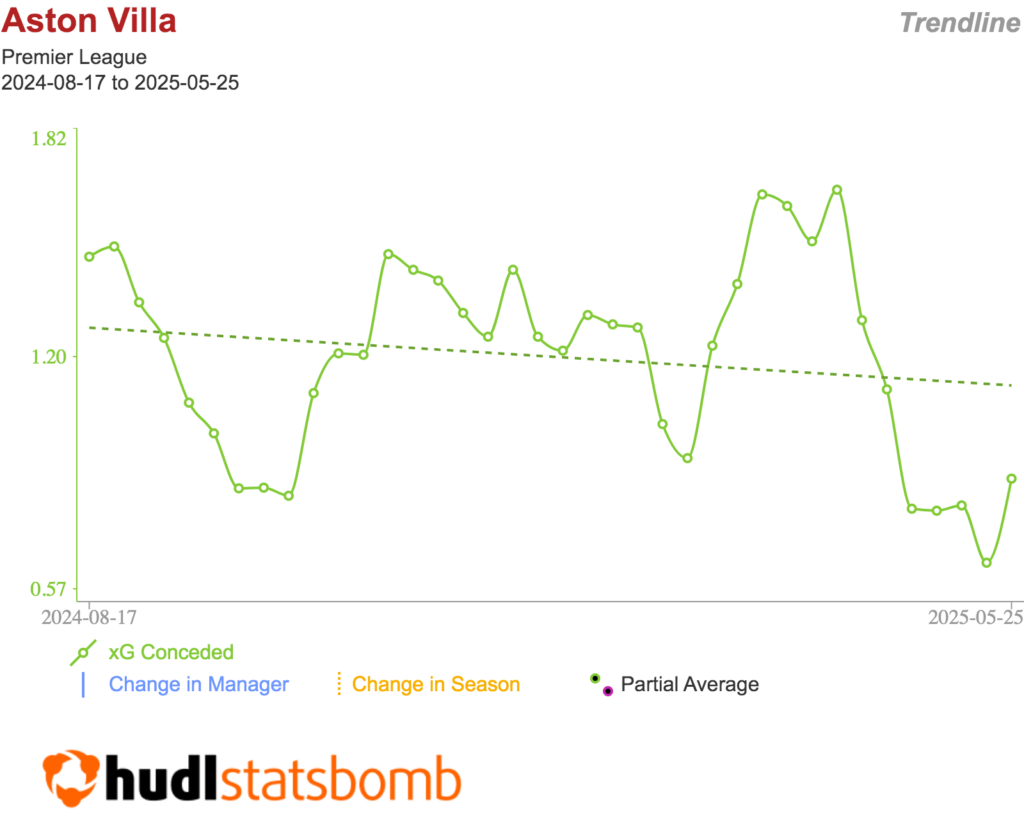 Unai Emery’s team achieved six clean sheets across their final 10 matches, with their xGC visibly dropping: