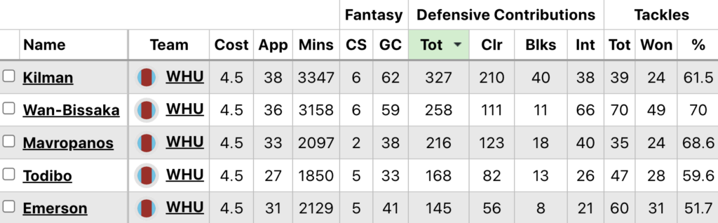 Above: West Ham defenders sorted by total defensive contributions (Tot) in 2024/25