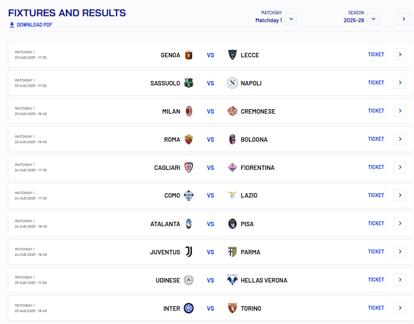 Taken from the Official Serie A website, we can see the first round of the upcoming 2025/26 campaign commences on Saturday August 23 at 5:30pm.