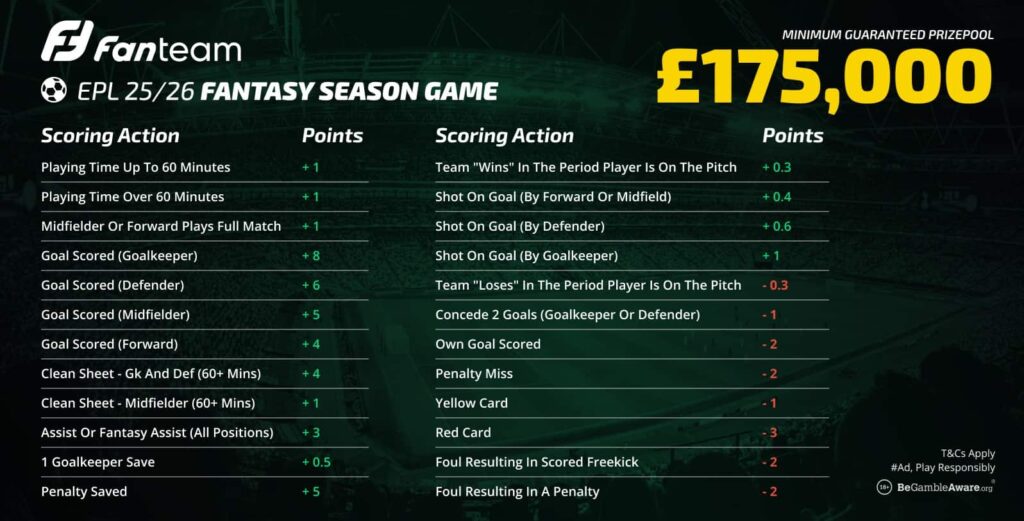 Now live, the season-long EPL Fantasy game costs £10 to enter, where there’s a guaranteed minimum prize pool of £175k. Finish inside the top 10% and you’ll get a share of this; come top and you’ll win at least £35k.