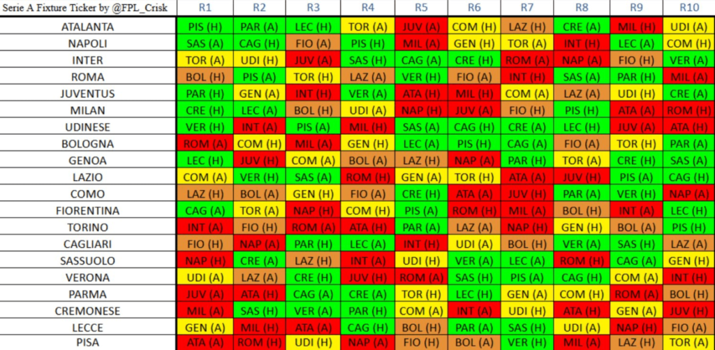 Pisa, Lecce, Cremonese, Parma and Verona all rank among the bottom five teams with the worst fixtures.