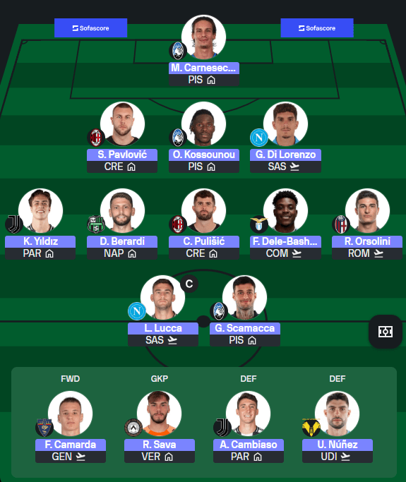 - Captaincy will be on Lucca or Camarda to start (Lucca is better, but I am a Milan fan and I would love for Camarda to score), and in case of necessity will be moved mainly between Pulisic, Dele-Bashiru, Yildiz, with Sava as my last-ditch hope.