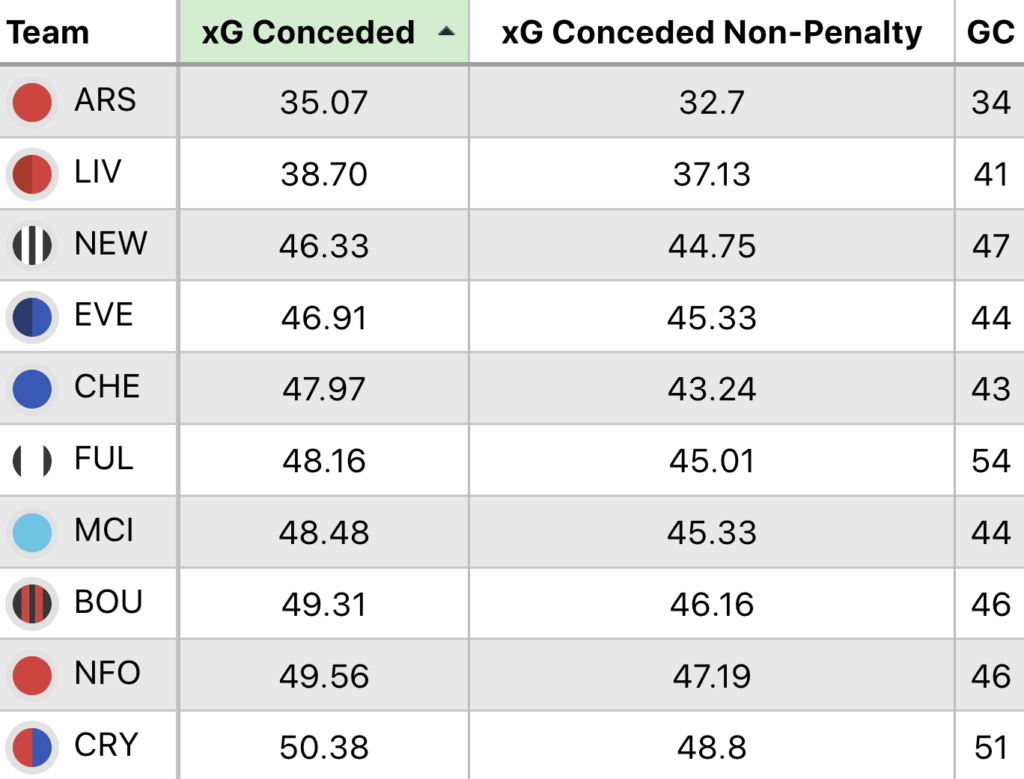Above: Team sorted by xG conceded in 2024/25