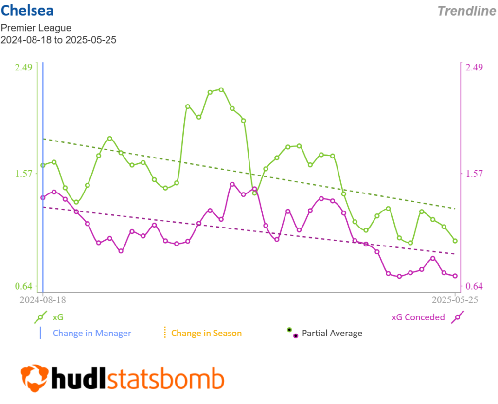 Chelsea’s defensive numbers really improved as last season wore on, as you can see from the rolling six-match graphic above.