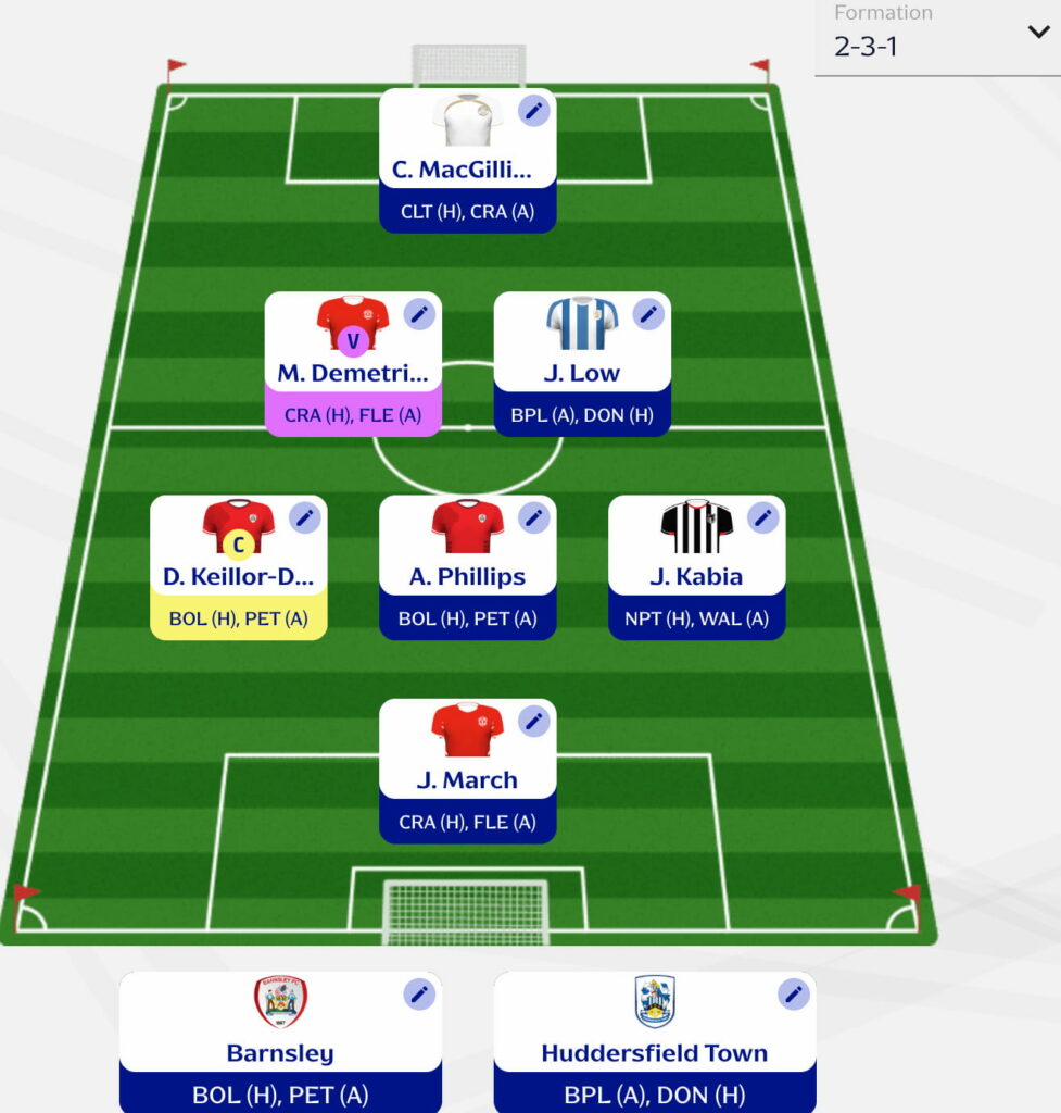 Barnsley have argubly the best “midfield” in the division, and for that reason, Davis Keillor-Dunn (M) and Adam Phillips (M) make my side at present.