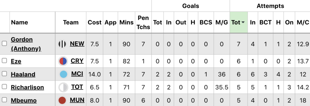 Gordon did, however, rack up more shots than any other player on the opening weekend (seven). In the absence of Alexander Isak (£10.5m), he lined up centrally at Villa Park, and considering how vulnerable Liverpool looked on Friday, there is potential for him to do well.