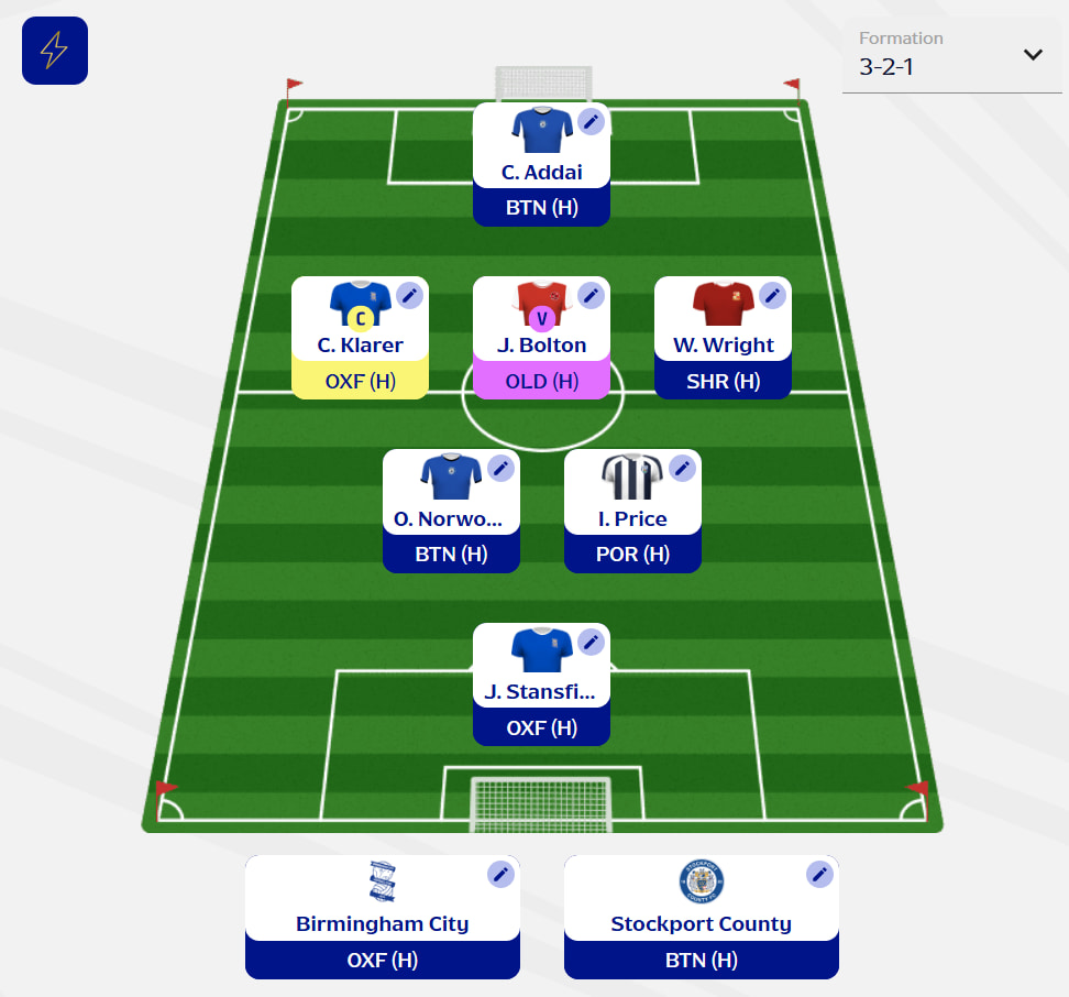 Picking my forward was relatively easy this week. I think Birmingham will score a handful of goals, and leading the attack is, of course, penalty taker Jay Stansfield (F).