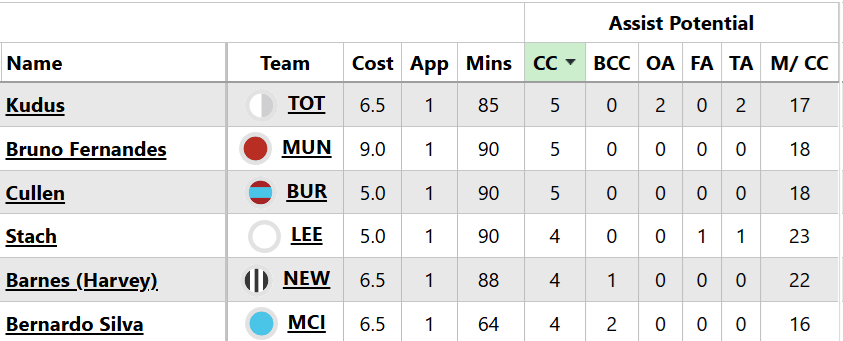 Above: FPL midfielders sorted by chances created (CC) in Gameweek 1