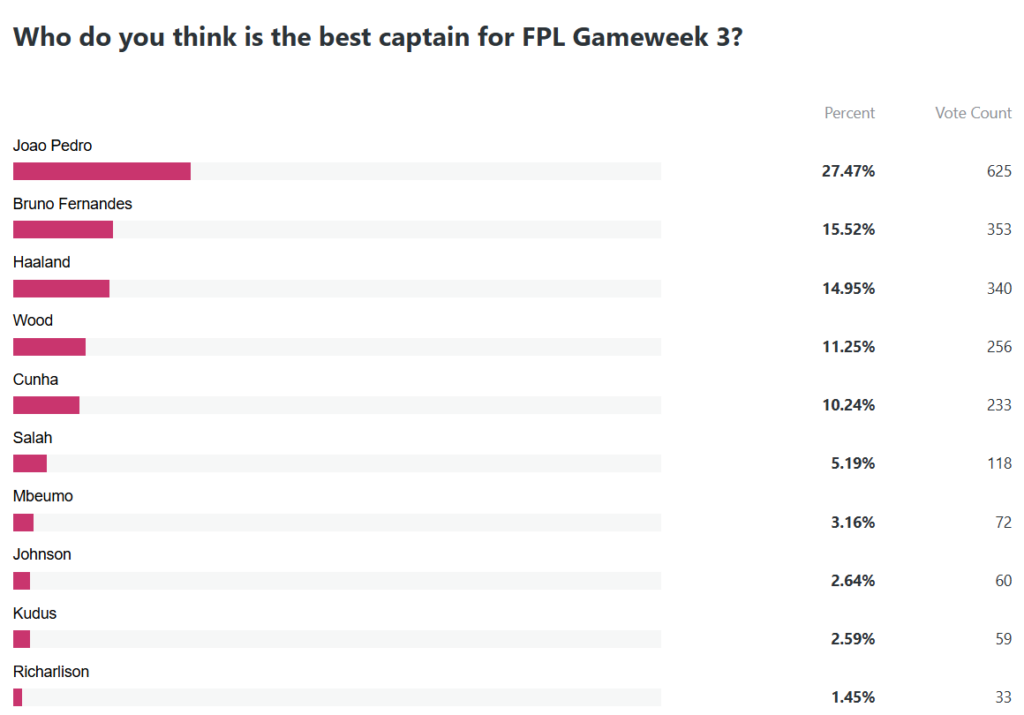 Fresh from his 15-point haul against West Ham in Gameweek 2, Joao Pedro (£7.5m) leads the Fantasy Football Scout captaincy poll. The highest-owned player in Fantasy currently boasts 27% of the vote.
