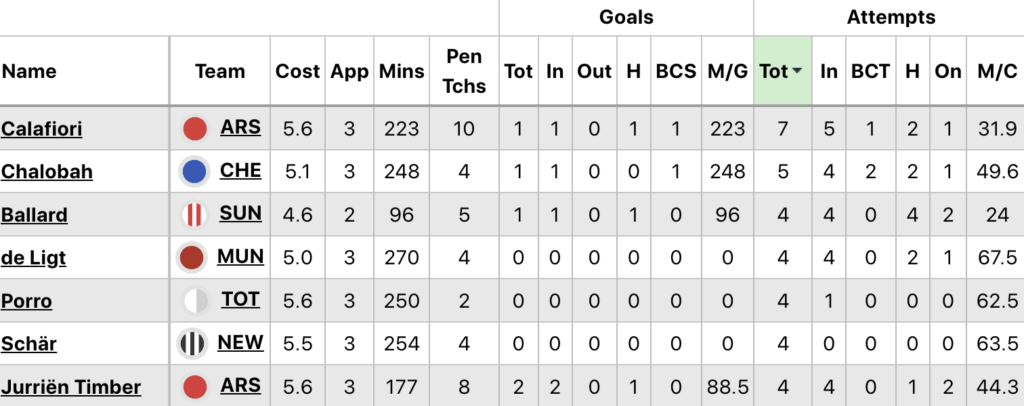 Above: Defenders sorted by shots (Tot) in 2025/26