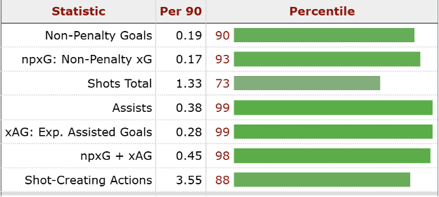 According to FBref over the last 365 days, he is in the top one per cent of midfielders across Europe’s big five domestic leagues for assists, expected assists, touches in the attacking penalty area and progressive passes received per 90 minutes played.
