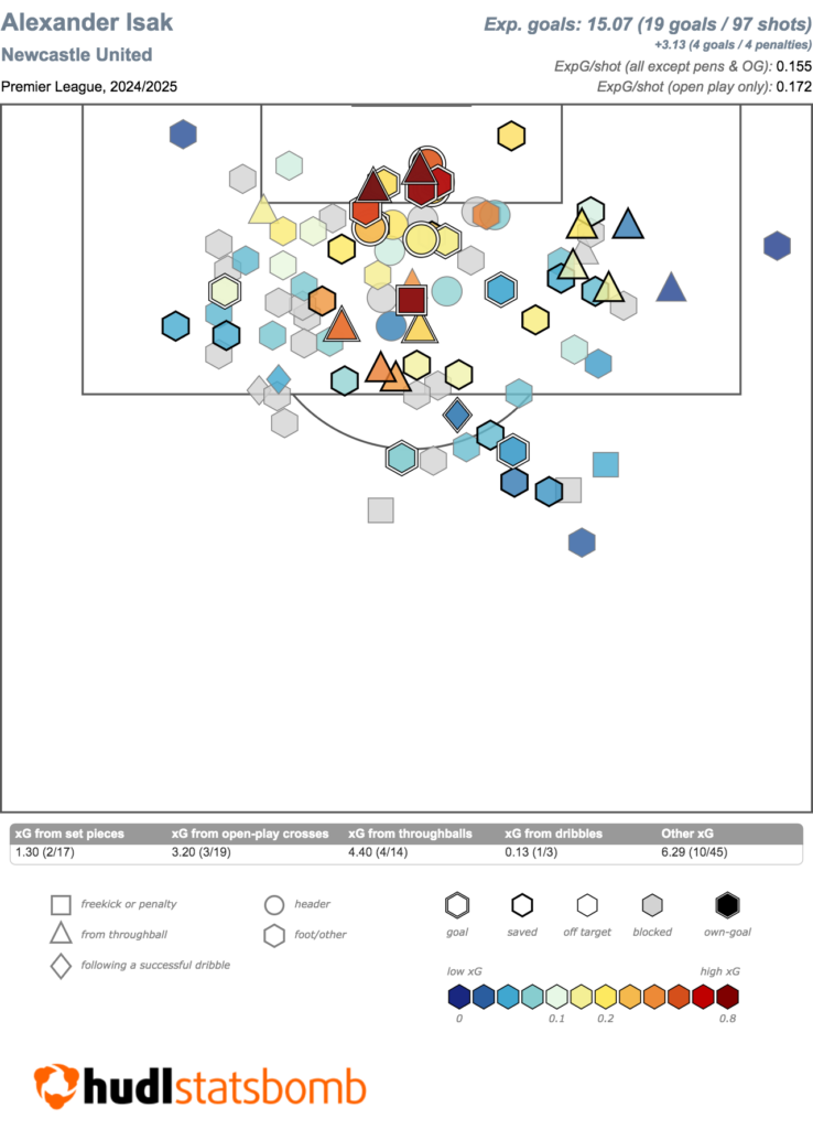 At 6ft 4in, he offers an aerial presence as well and scored four goals from 14 headed attempts last season. He is definitely more comfortable with his favoured right peg than his left, though, having scored only one league goal with the latter foot in 2024/25.