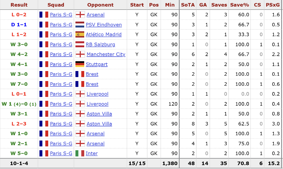 Donnarumma has also forged a reputation as a penalty-saving specialist. The 26-year-old has made 14 spot-kick saves in top-flight football, and that’s without counting penalty shoot-outs. The Naples native thrives in such high-voltage scenarios, shining memorably at Euro 2020 but also in last season’s Champions League when his heroics helped eliminate Liverpool in the round of 16. Donnarumma was exceptional in that second leg at Anfield, and was even better in the semi-final against Arsenal. The Gunners were the only side to outperform the Parisiens on expected goals (xG) in the knockout stage, but could find no way past the unflappable Italian, who made five saves from five shots on target.