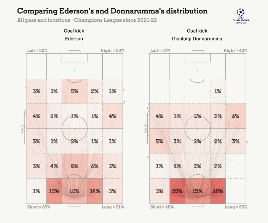 As the above graphic shows, Ederson excelled at playing longer balls as well as threading passes through the opposition’s press, while Donnarumma is more comfortable playing shorter passes.