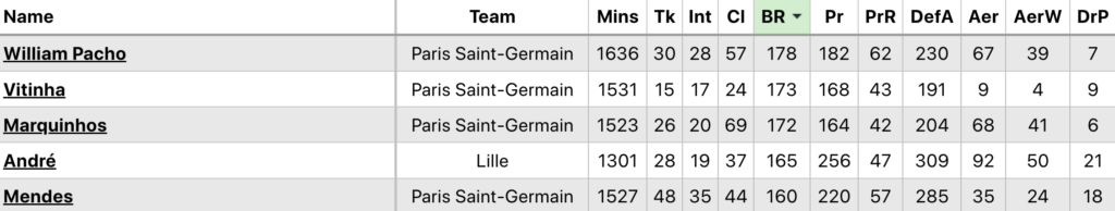 Defending stats, inc StatsBomb ball recoveries (BR) and tackles (Tk):