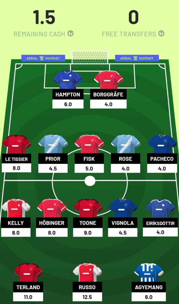 Ella Toone (£9.0m) top-scored with 13 points thanks to a goal, assist and maximum bonus. The England star was the heartbeat of Man Utd’s 4–0 win over Leicester City. In the same game, Elisabeth Terland (£11.0m) delivered as my captain.