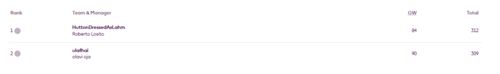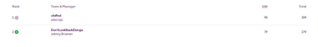 Olavi Oja leads for a third week in my Multiple Top 10k Finishes mini-league (league code tm6cxk) after following his Gameweek 3 Wildcard with a Bench Boost and has risen to 1,810th overall.