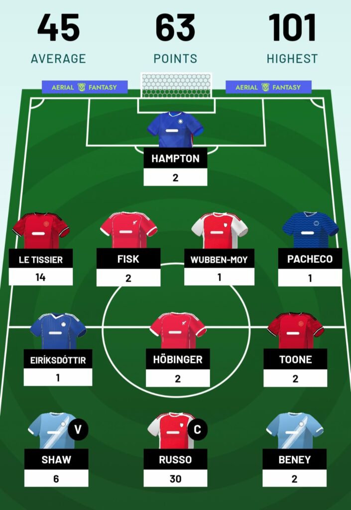Gameweek 2 brought a strong return of 63 points, which was well above the 45-point average. The highlight was Alessia Russo (£12.5m) returning 30 points as my captain. She was supported by a huge 14-point haul from Maya Le Tissier (£8.0m). While the defence was patchy elsewhere, and midfield underwhelmed, the captaincy call made all the difference.