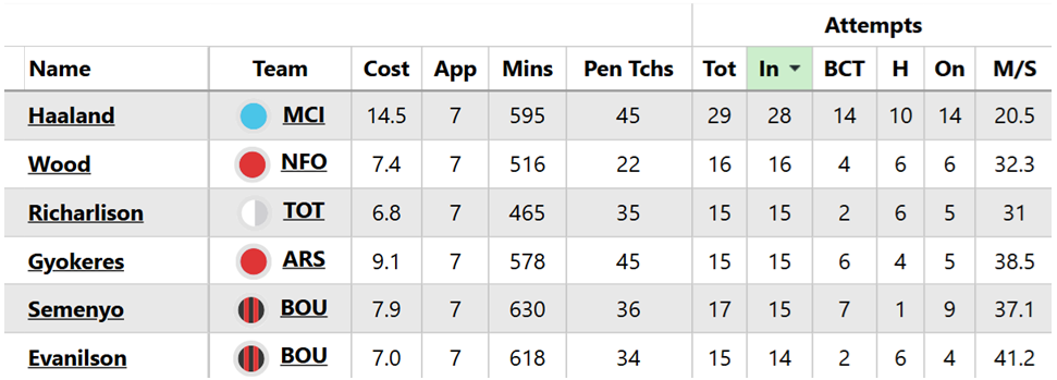 The league leader for goals (nine), attempts (29), big chances (14) and expected goals (xG, 7.71 – see below image) has overtaken Mohamed Salah (£14.4m) for both price and ownership.