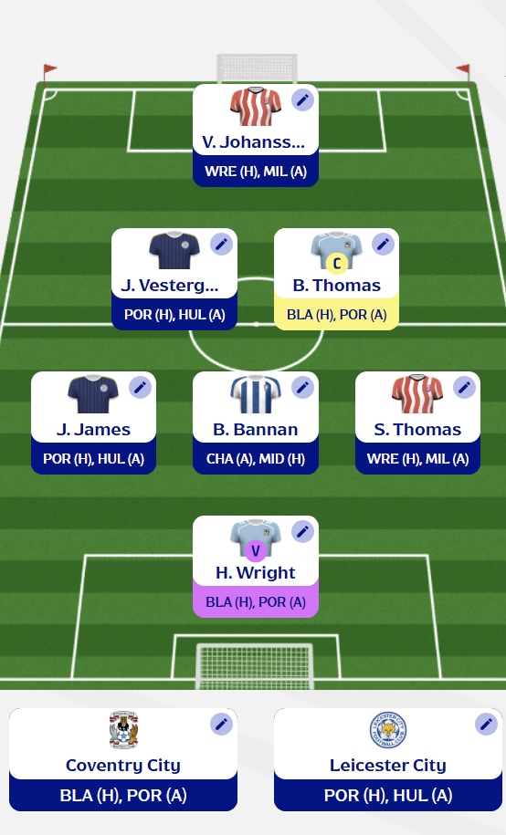 Joining him is Bobby Thomas (D) with Coventry going into Gameweek 12 off the back of keeping four consecutive league clean sheets. Thomas has benefitted from that defensive form – collecting between seven and 15 points in each of his previous four games, including three assists. The Englishman also takes my captain’s armband.