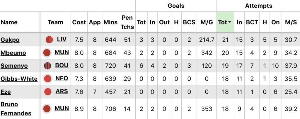 Above: No FPL midfielder has registered more shots than Cody Gakpo in 2025/26