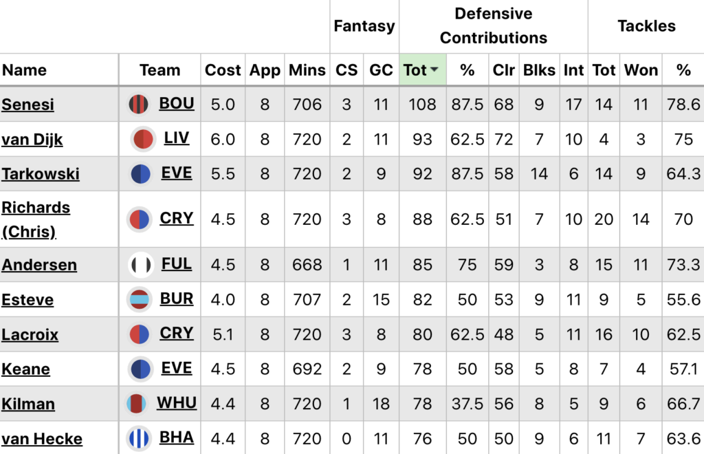 Above: Defenders sorted by total defensive contributions (Tot) in 2025/26