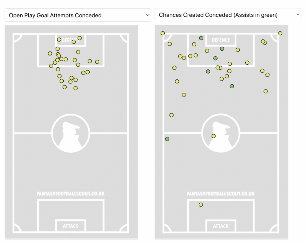 Above: Wolves’ open play goal attempts conceded (left) and chances created conceded (right) over the last four Gameweeks