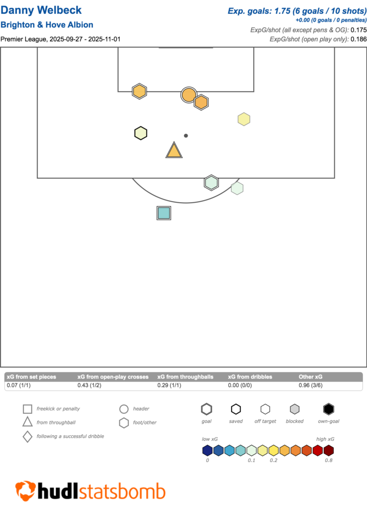 He’s impressively buried six of them, as shown below, but Welbeck’s conversion rate has traditionally hovered around the 15% mark in recent years.