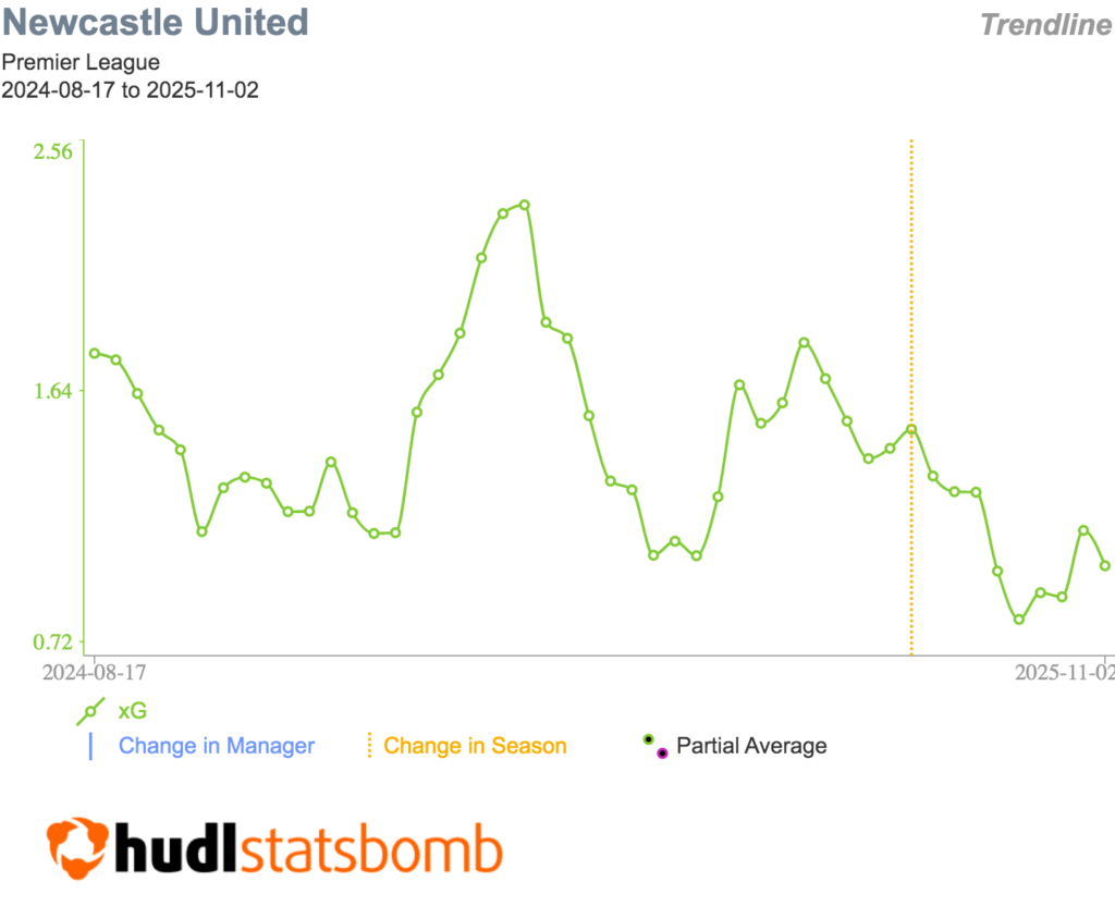 The primary concern isn’t Yoane Wissa (£7.3m), who, as stated by Howe, will require a “six-week pre-season” to get him up to speed, but rather the decline in Newcastle’s attacking output, which is captured below.