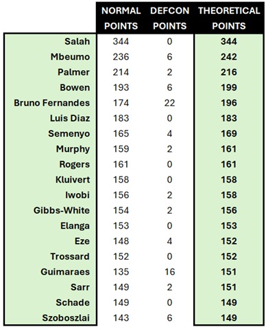 However, when checking out 2024/25’s top midfielders, the existence of DefCon would’ve given big boosts to Caicedo, Anderson, Joao Gomes (£5.3m) and Idrissa Gueye (£5.4m), albeit not enough to have them amongst the leading men: